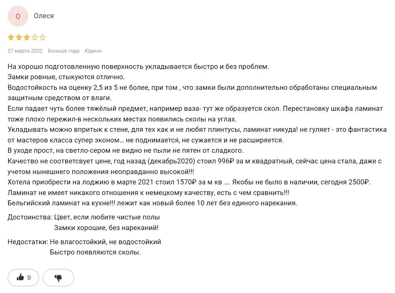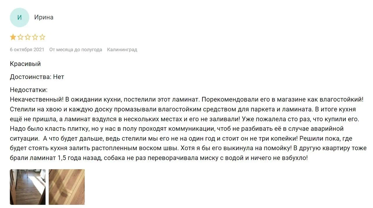 «Никогда не верили в водостойкость ламината, пока не столкнулись с протечкой трубы. Ни капли не пропустил воду, чем спас от затопления нижнего этажа. От контакта с водой не испортился, шубой не поднялся, обсушили и как ничего не было!».