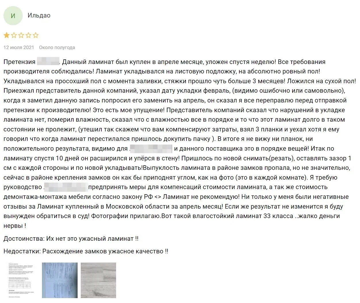 «Ламинат укладывался на листовую подложку, на абсолютно ровный пол! Укладывался на просохший пол с момента заливки, стяжки прошло чуть больше 3 месяцев! Ложился на сухой пол! Итак по ламинату спустя 10 дней он расширился и упёрся в стену! Пришлось по новой снимать(резать), оставлять зазор 1 см с каждой стороны и по новой укладывать! Вот такой влагостойкий ламинат 33 класса ..жалко деньги нервы!»